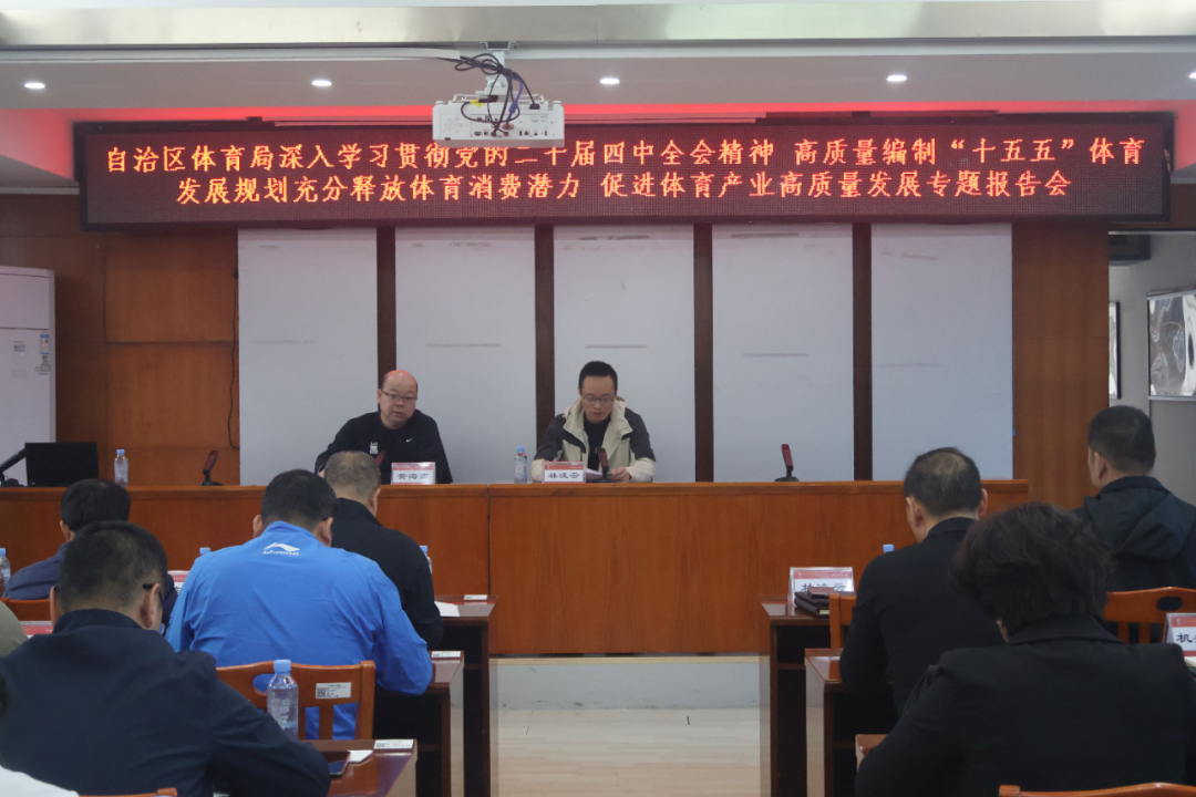 11月18日,比分足球 举行“深入学习贯彻党的二十届四中全会精神 高质量编制‘十五五’体育发展规划 充分释放体育消费潜力 促进体育产业高质量发展”专题报告会。局党组成员、副局长林凌云主持会议,局党组成员、副局长梁剑波以及驻局纪检监察组、局机关各处室、各直属单位有关负责同志等共30多人参加会议。