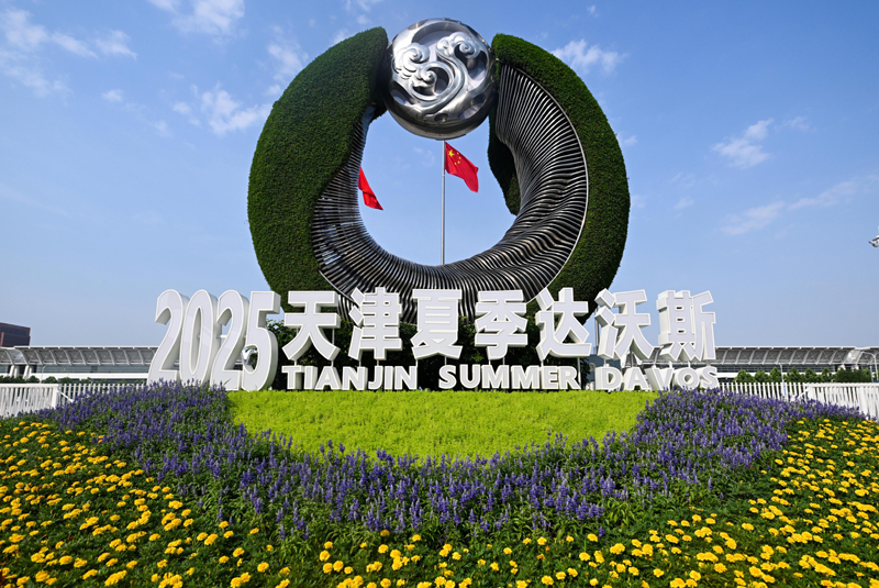 6月25日在国家会展中心(天津)外拍摄的2025年夏季达沃斯论坛主题花坛。