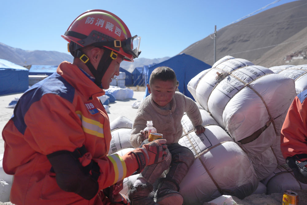 2025年1月8日,在西藏定日县措果乡塘仁村安置点,消防救援人员和小朋友互动。1月7日,西藏日喀则市定日县发生6.8级地震。新华社记者 晋美多吉 摄