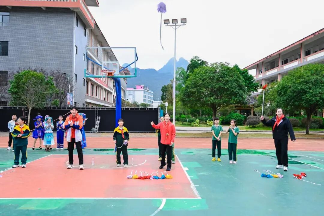 操场上的互动更加热烈,三位冠军与同学们开启充满民族特色的互动体验。这正是古代六艺在壮族文化中的生动延续—— 竹竿舞的清脆敲击声中,进退起落间的默契配合,恰似“御”术所强调的协作与节奏把控;抛绣球比赛中,瞄准目标、精准投掷的专注模样,传承了“射”术的专注力内核。