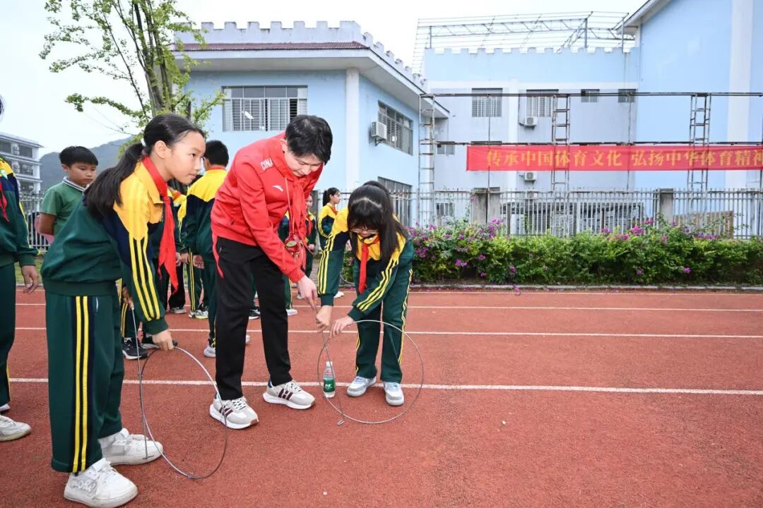 冠军们跟着同学们的示范尝试竹竿舞,在欢声笑语中感受壮族传统游戏的协作魅力。手持象征美好寓意的绣球与同学们组队投掷,操场上欢呼声此起彼伏。滚铁环项目里,冠军们重拾童年记忆,握着铁环推杆稳步前行。这场古代六艺与壮族民俗体育、竞技体育的碰撞,让冠军们深切感受广西文化的独特魅力,也让同学们在轻松互动中进一步拉近与冠军的距离。