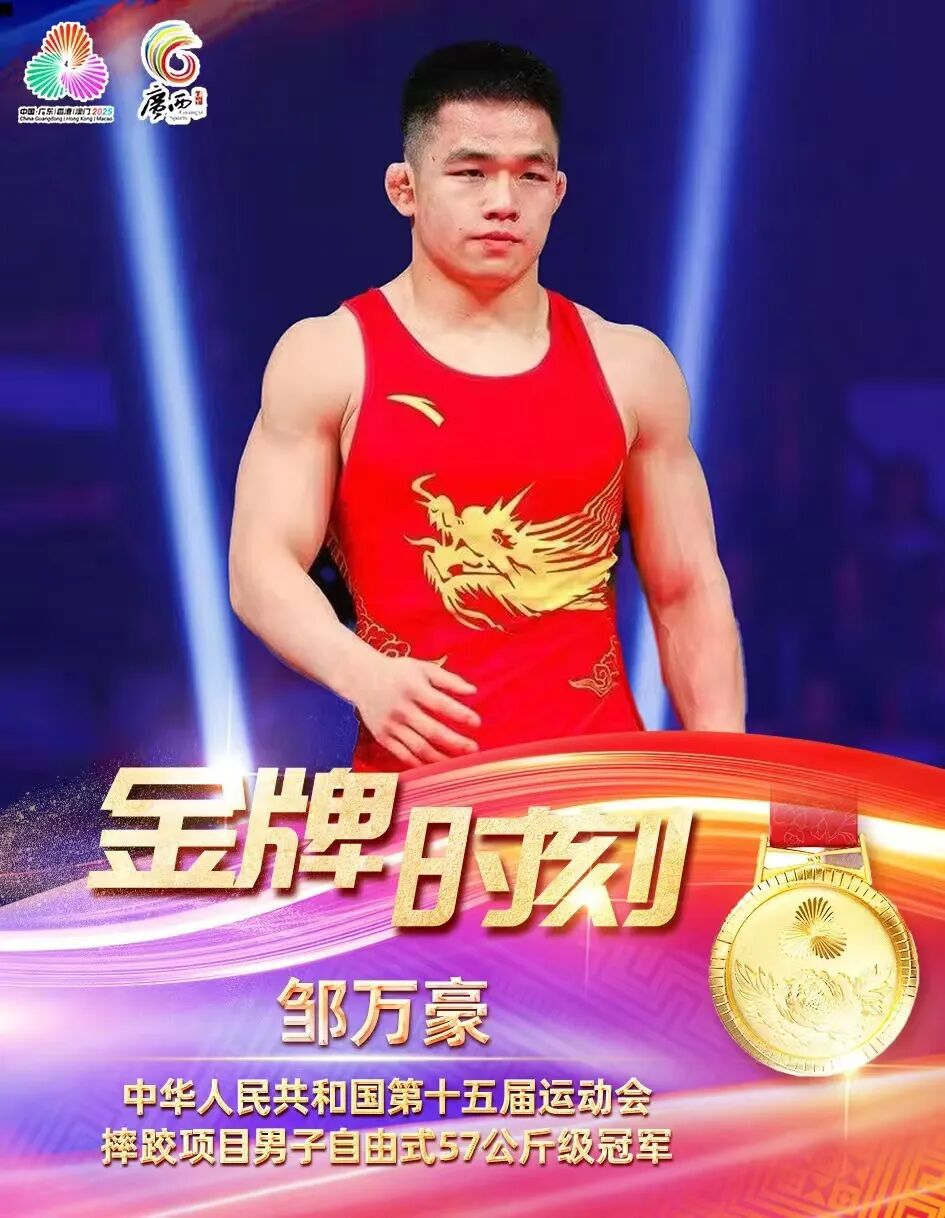 11月11日,在第十五届全国运动会摔跤男子自由式57公斤级比赛中,我区运动员邹万豪、刘明瑚顽强拼搏、勇创佳绩,包揽男子自由式57公斤级金银牌,其中邹万豪获得冠军,为比分足球 代表团斩获本届全运会第四枚金牌。