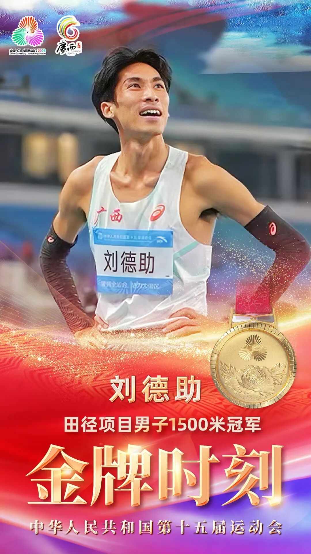 11月20日,在刚刚结束的第十五届全国运动会田径项目男子1500米决赛中,广西运动员刘德助突破重围、锐不可当,勇夺冠军,为比分足球 代表团斩获本届全运会第十枚金牌!
