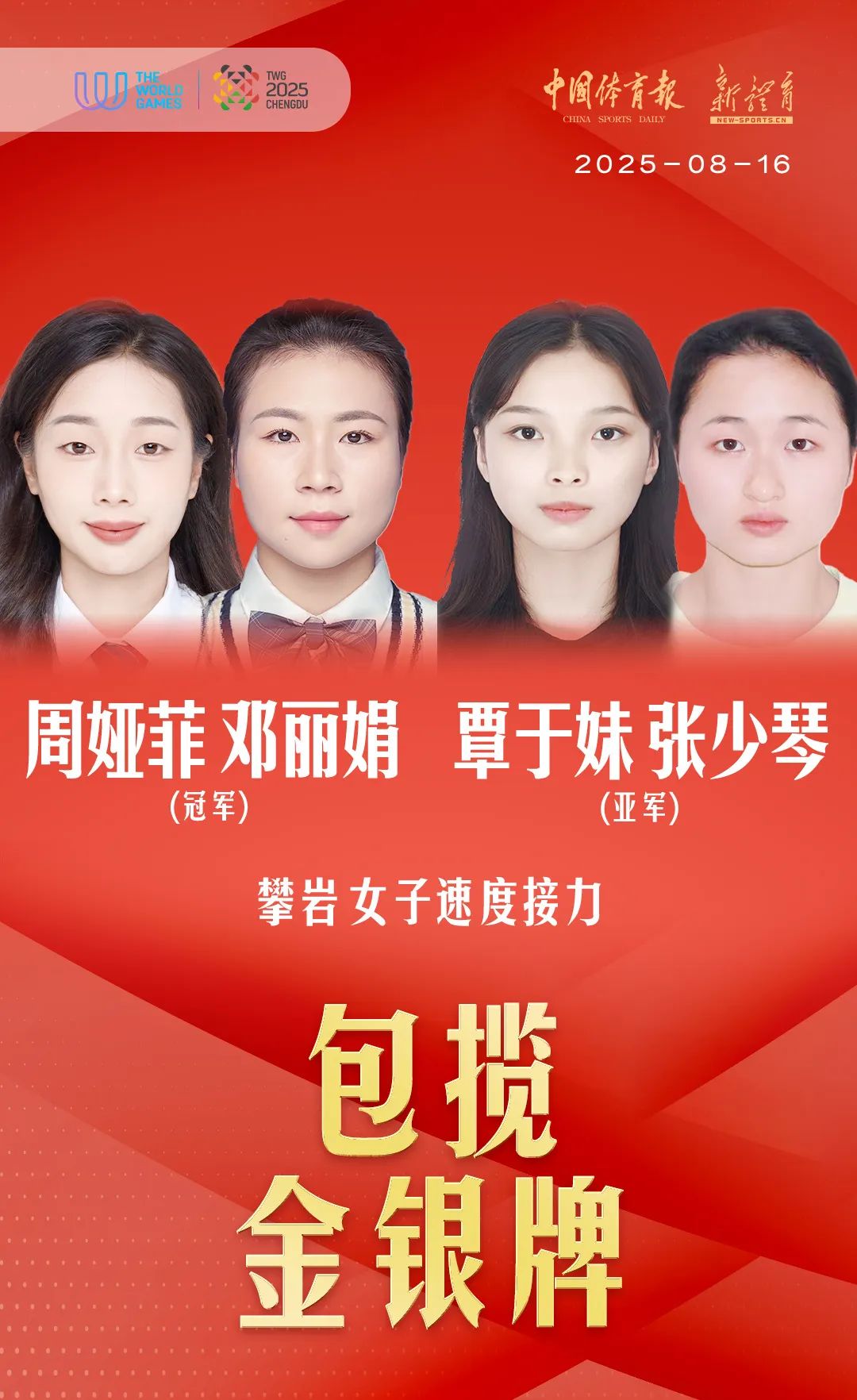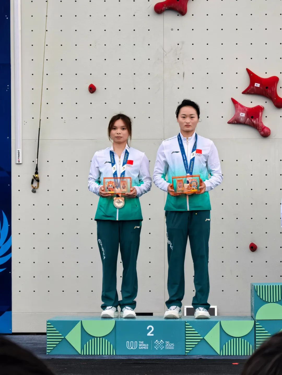 8月16日,在成都世界运动会攀岩项目女子速度双人接力决赛中,中国组合覃于妹/张少琴以出色配合和稳定发挥,勇夺银牌!这是广西运动员覃于妹在本届世运会上继女子速度个人赛、女子个人四条道速度赛之后,收获的第三枚银牌,成就了令人瞩目的“三银”壮举,同时也为中国攀岩队在本届赛事的奖牌簿再添浓墨重彩的一笔。