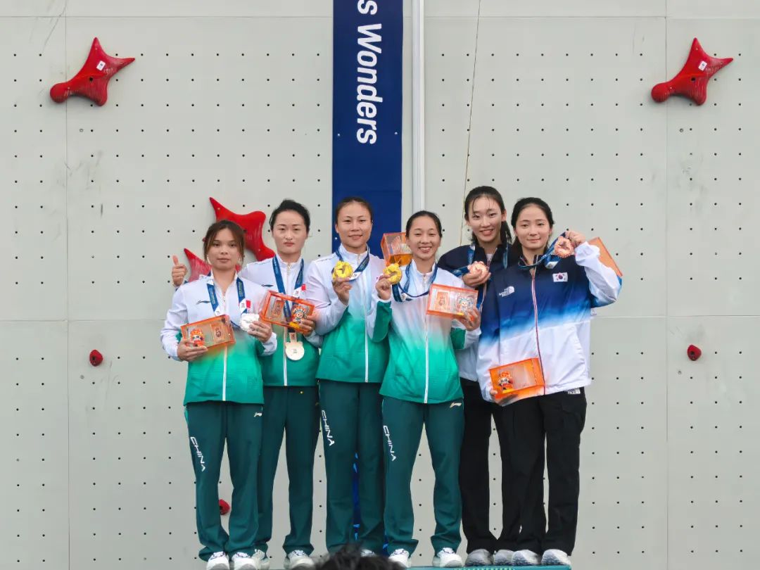 覃于妹(左一)/张少琴(左二)获得攀岩女子速度双人接力银牌