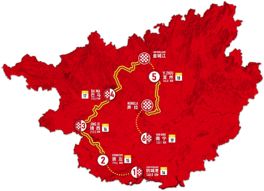 2025环广西世巡赛共设6个赛段,依次为防城港城市赛段,崇左-靖西赛段,靖西-巴马赛段,巴马-金城江赛段,宜州-弄拉景区赛段以及南宁城市赛段,赛道形式包含平路绕圈、环山丘陵、终点爬坡等,6站比赛赛道总距离1043公里,除全程25.9公里为中立骑行距离外,实际计入成绩的竞赛总距离为1017.1公里。此外,赛事转场距离370公里,整体总里程为1413公里。