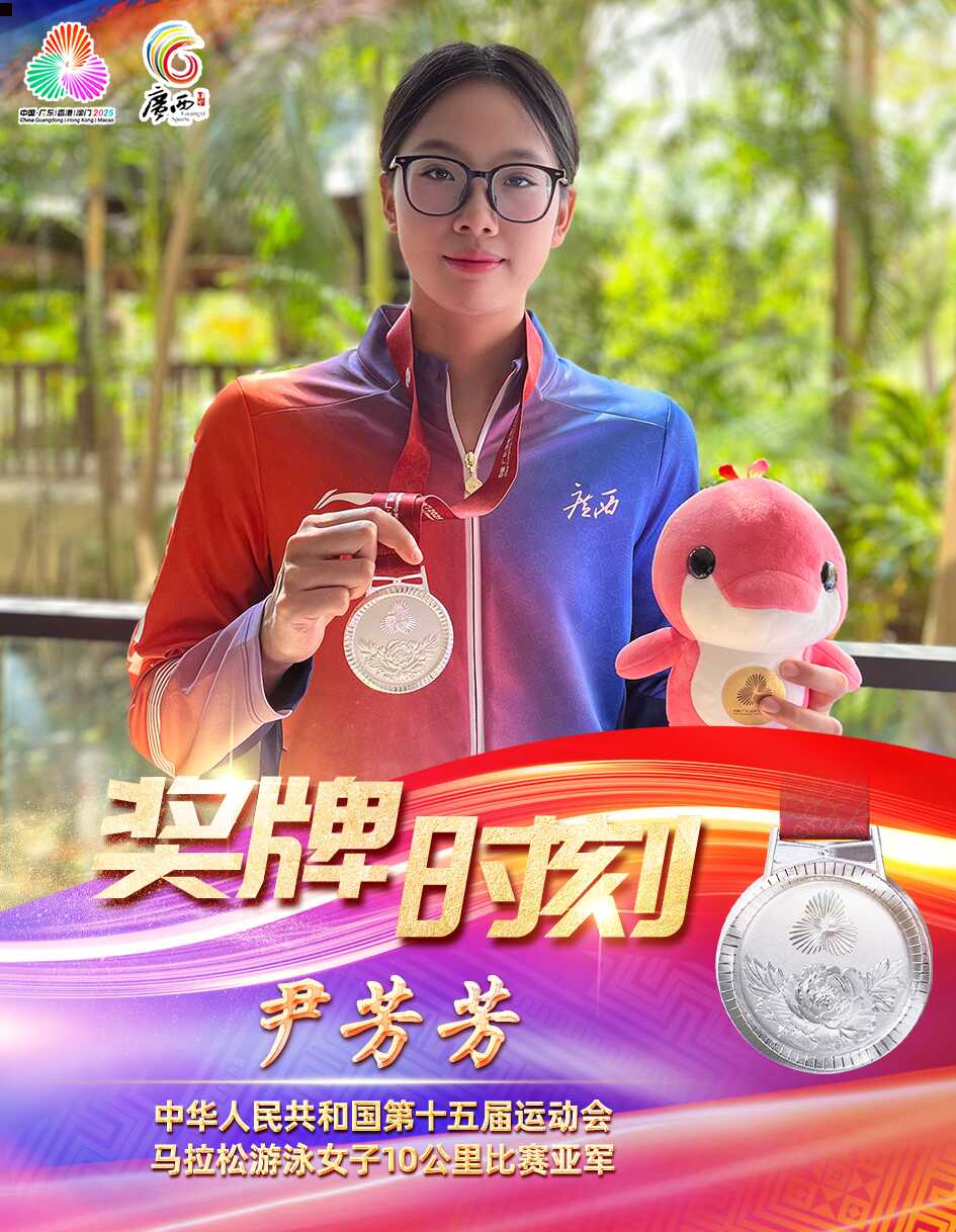 2025年11月5日,在第十五届全国运动会马拉松游泳女子10公里决赛中,广西运动员尹芳芳以2小时12分4秒8的成绩获得亚军,这是广西运动员在全运会该项目上的首枚奖牌。