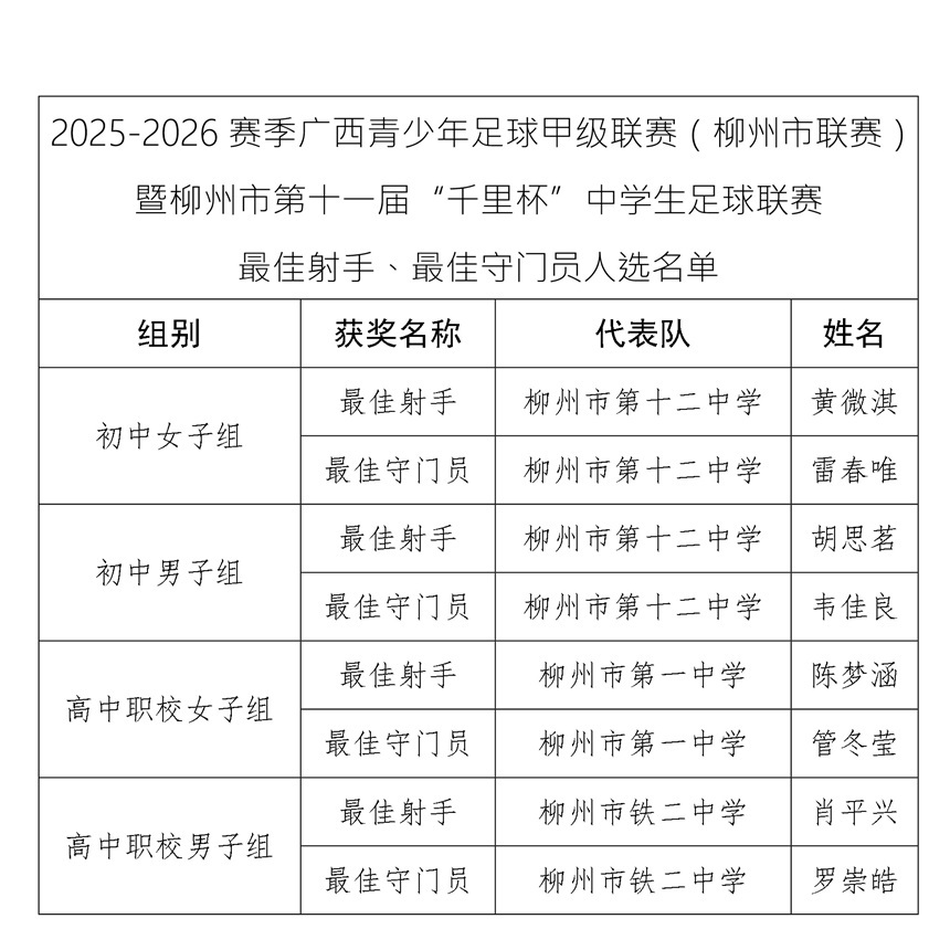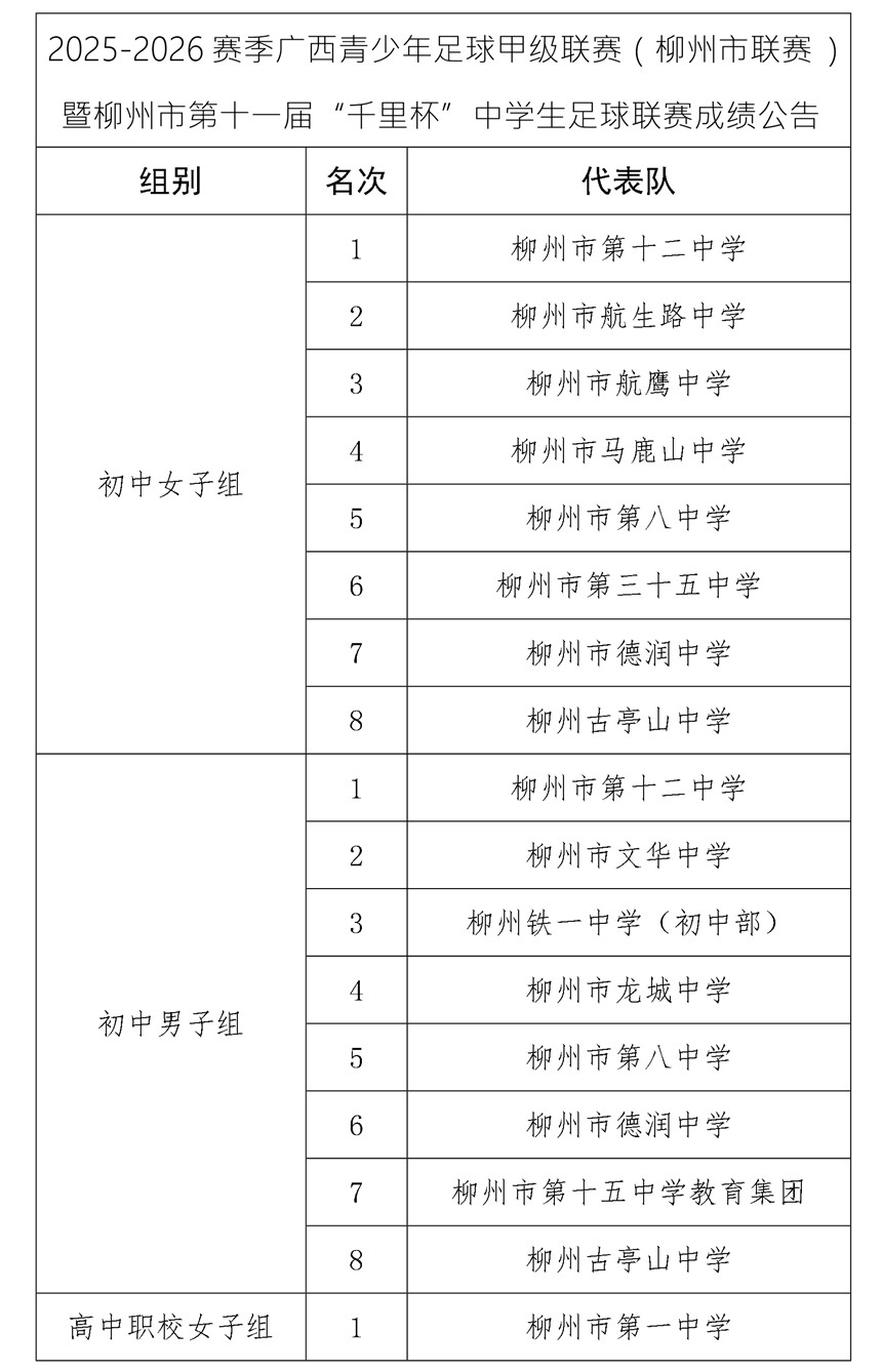 2025-2026赛季广西青少年足球甲级联赛由比分足球 、自治区教育厅联合主办,联赛实行自治区总决赛(赛会制)+设区市联赛(主客场制)赛制体系。本次获得柳州市初中组和高中男子组冠军的队伍将代表柳州市出战自治区总决赛,期待他们在总决赛中能够继续凭借出色的表现,顽强拼搏的精神和默契的团队配合,一展柳州体育精神,再获佳绩。