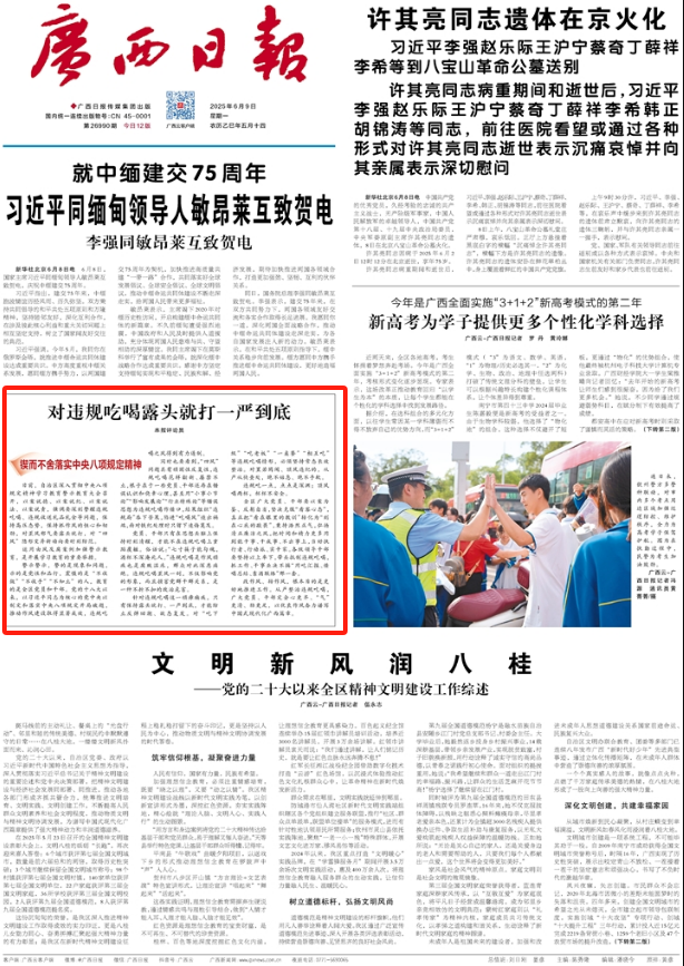 6月9日《广西日报》头版刊发文章《对违规吃喝露头就打一严到底》