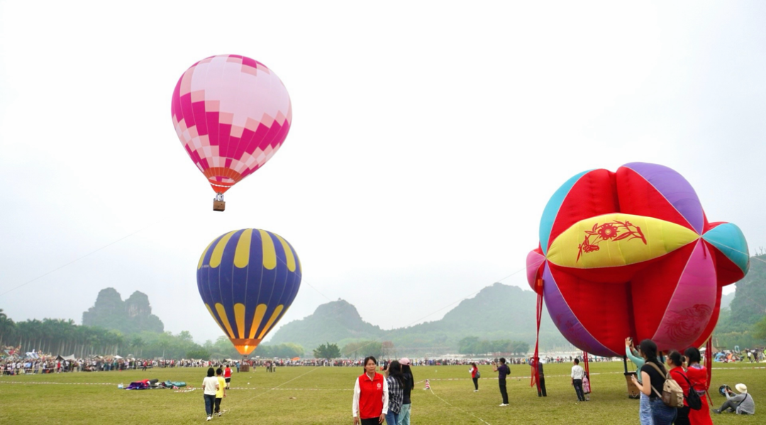 在体验区,最吸引游客的是热气球系留展演及体验,热气球利用天然气加热升空,众多游客身穿民族服饰乘坐热气球、打卡拍照、欣赏风景,在体验航空体育过程的同时,感受广西民俗文化的魅力。
