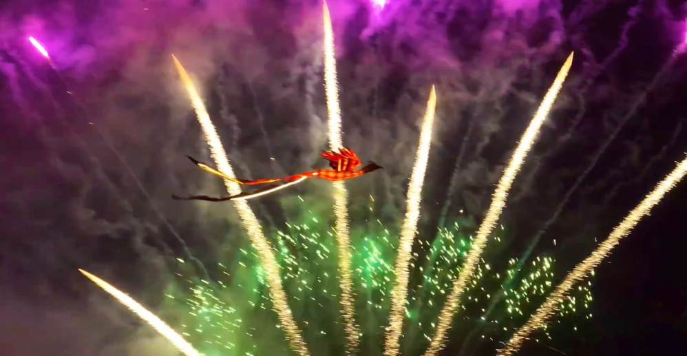 航模飞行展演上最具亮点的节目是“凤飞九州”,凤凰造型的飞行器缓缓从天空飞过,紧接着烟花升腾而起,犹如星光瀑布直落而下, 利用视觉的错位,营造“凤凰”从烟花中飞出的效果,寓意着凤凰涅槃,浴火重生,为观众献上了一场绚丽夺目的航空体育烟花秀。