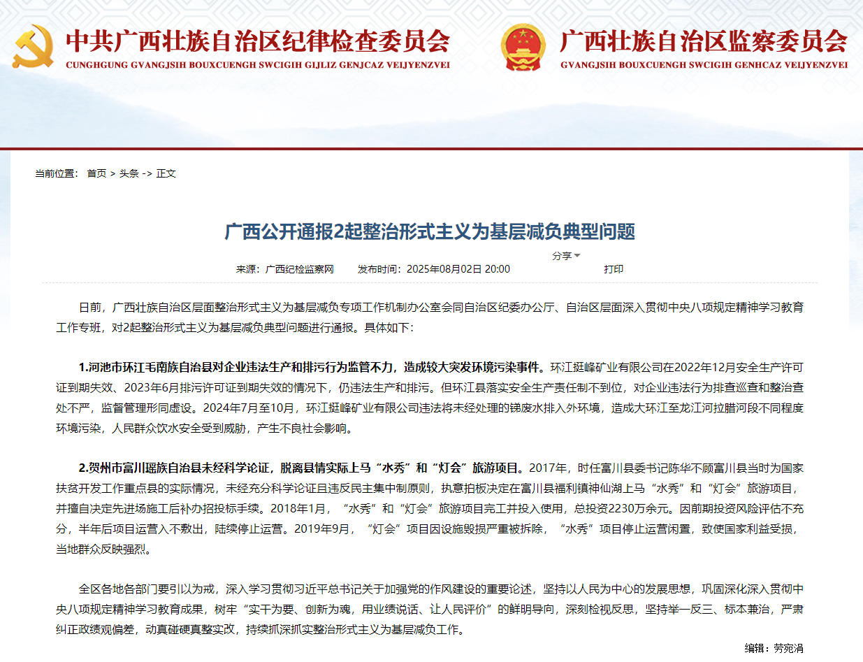 日前,广西壮族自治区层面整治形式主义为基层减负专项工作机制办公室会同自治区纪委办公厅、自治区层面深入贯彻中央八项规定精神学习教育工作专班,对2起整治形式主义为基层减负典型问题进行通报。具体如下: